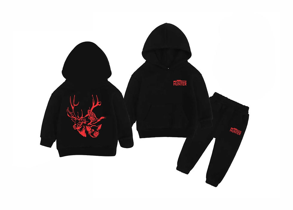This cozy and stylish kids' tracksuit set is made from a perfect blend of polyester and cotton, offering ultimate comfort and durability. With a soft fleece lining inside, it keeps little ones warm and snug all day long. Featuring a fun and unique junior hunter design, this tracksuit is perfect for active adventures and everyday wear. It’s the ideal combination of style, comfort, and warmth for your young explorer!